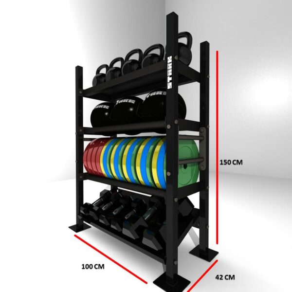 The Stark Storage Units are the perfect solution for organizing a wide range of your fitness equipment. Our storage racks are made out of the same high-quality steel as our pull-up rigs and made of a modular design to allow for a lot of customizations and attachments. With adjustable shelving based on the items you want to store – Option to choose up to 4 different levels of shelves – Wall ball/bumper plate shelf combo, dumbbell shelf, or kettlebell shelf – Available shelves length (100,150,200,250 cm) – Standard width 43 cm – Maximum height 150cm (Could be less as per client request ) – Black Powdercoat Finish – Wheels not included (optional) Please note that the standard manufacturing time for all units is 10 business days