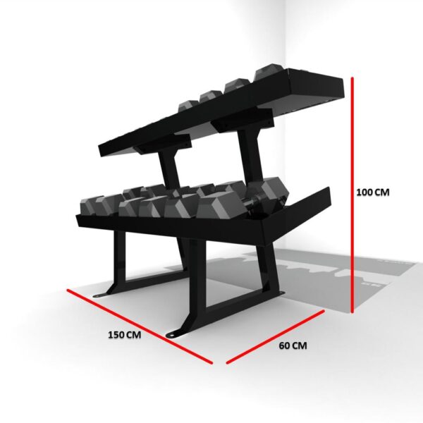 The Stark dumbbell storage rack has 2 tiers to keep your gym well organized ,Ideally suited for use with our hex rubber dumbbells, Constructed with a 5cm lip in order to keep all your dumbbells secured, available in 1,1.5&2m Important: The Dumbbell Rack is a built-to-order product and may require 7-12 days lead time